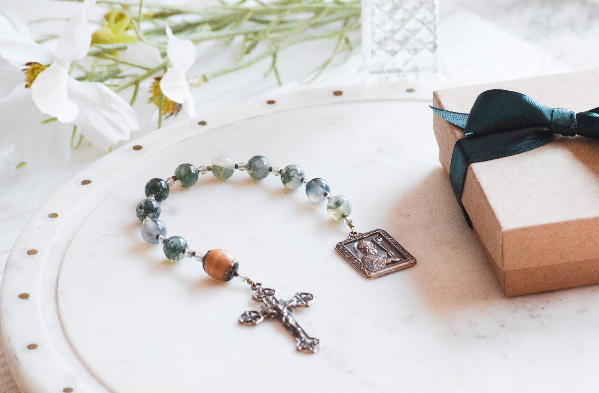 With 10 8mm moss agate Hail Mary beads and a 10mm olive wood Our Father, our pocket rosaries are substantial enough to feel good in the hand and portable enough to live in your pocket or car.