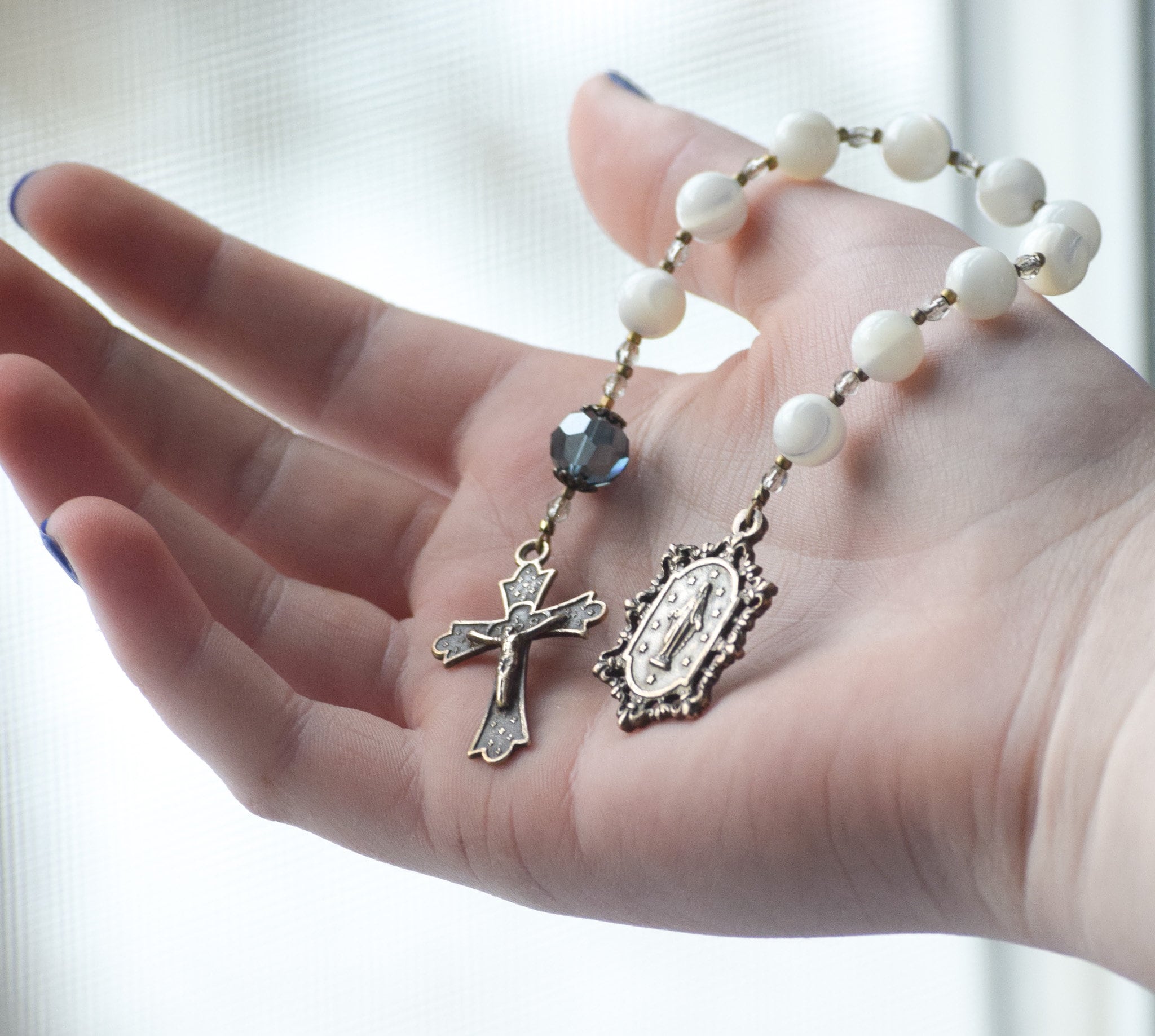 This stunning, feminine pocket rosary features 8mm mother of pearl Hail Mary beads with a 10mm Swarovski crystal Our Father bead.