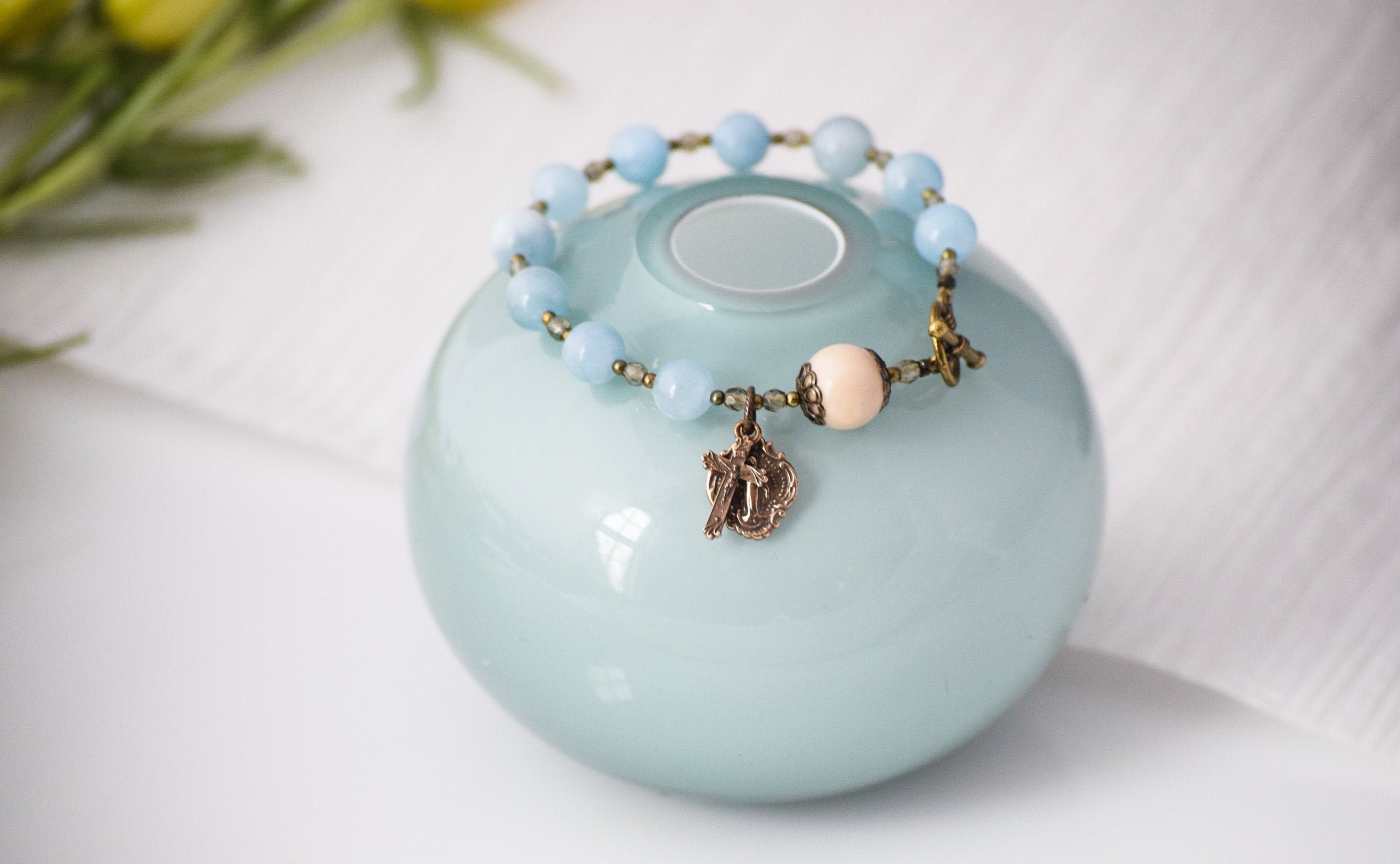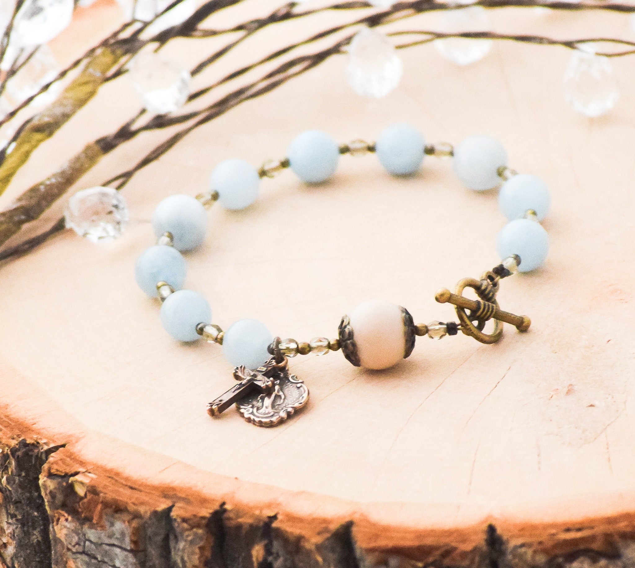 This stunning natural aquamarine gemstone rosary bracelet is a beautiful, wearable reminder of Our Lady's constant intercession.